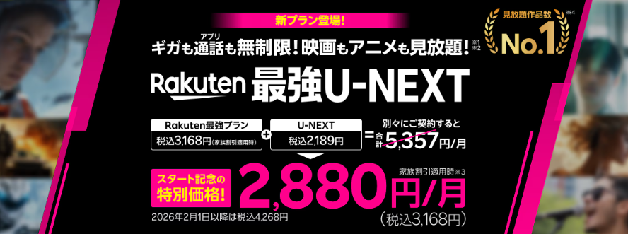 ・Rakuten最強U-NEXTはデータ無制限の通信とU-NEXT見放題をセットにした新料金プラン