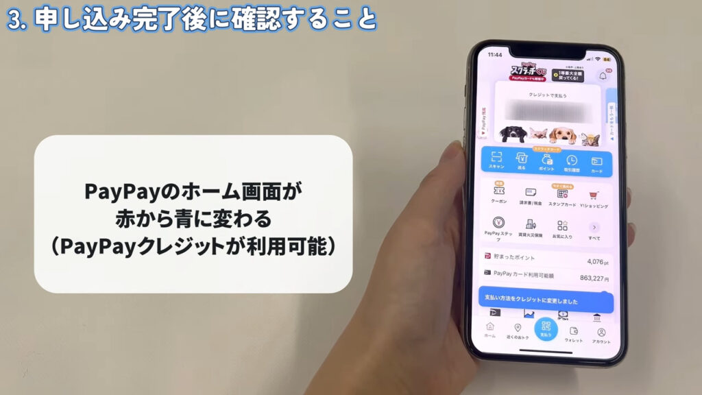 PayPayアプリから申し込みを行い手続きを完了すると、ホーム画面の表示が変化し、PayPayクレジットの利用準備が整います。
