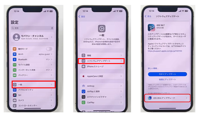 4. 画面の下の方に表示される「iOS 26にアップグレード」をタップ。