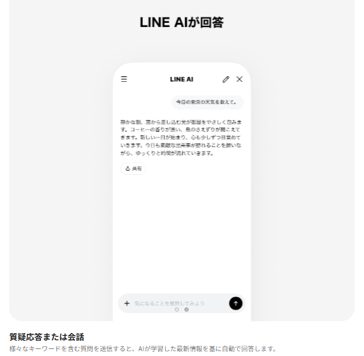通常の検索エンジンを使う感覚で、LINE AIに質問を投げかけることが可能です。画面に表示された入力欄に質問を送信すると、AIがテキストで答えてくれます。