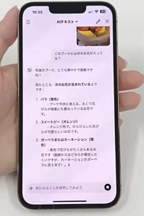 例えば、もらったブーケの写真をアップロードして「このブーケには何のお花が入ってる?」と送ってみたとします。すると、AIが写真を瞬時に分析し、写っているお花の種類をひとつひとつ正確に教えてくれました。