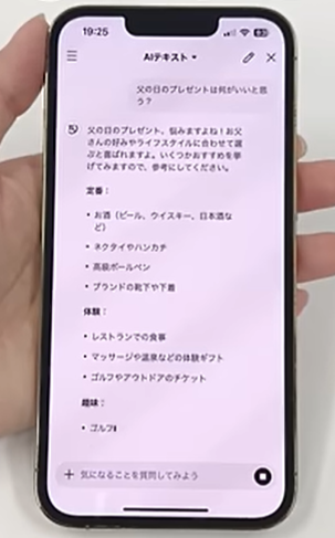実際に「父の日のプレゼントは何がいいと思う?」とLINE AIに送ってみたところ、数秒で定番のプレゼントや体験型のプレゼントなどいくつかの候補が詳細に返ってきました。
