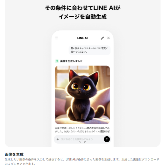例えば、上記画像のように「黒い猫をキャラクターのように可愛く描いてください。」と生成したい画像の条件を入力して送信すると、LINE AIが条件に合った画像を生成してくれます。
