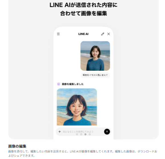 画像を添付して編集してほしい内容を送信すると、LINE AIが自動で画像を編集してくれます。