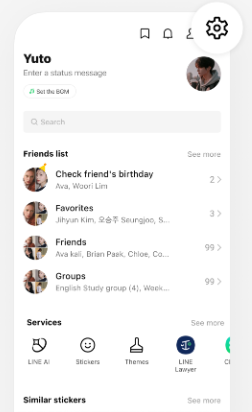 1. LINEアプリのホーム画面を開き、右上の歯車マーク(設定)をタップする。