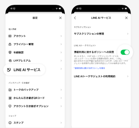 ・「LINE AI トークサジェスト」は、「LINE AI サービス」から設定をオンにすることで利用できる