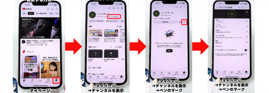 3.チャンネルページが表示されたら、画面右側のペンマークを選択します。