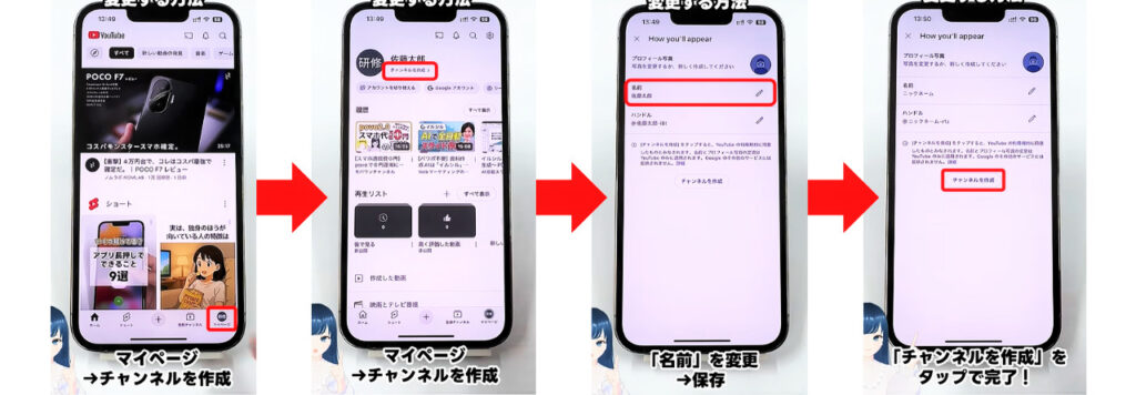 2.マイページの名前の下から「チャンネルを作成」を選択します。