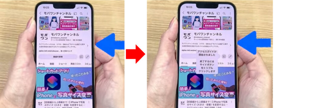 アクセスガイドが開始されると、開いているアプリでの画面操作はできますが、ホーム画面に戻ったり、他のアプリに移動したりといった操作はできなくなります