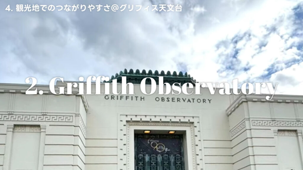 続いては、映画『ラ・ラ・ランド』の舞台としても有名な「グリフィス天文台」。有名な山の上のハリウッドサインを見ることができ、映画のロケ地にもなっている人気スポットです。