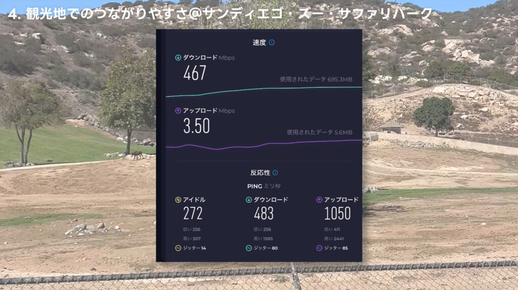 人口密度の影響なのか、ロサンゼルス近郊での通信速度は総じて高く、日本にいるときよりも快適さを感じる場面も多かったです。