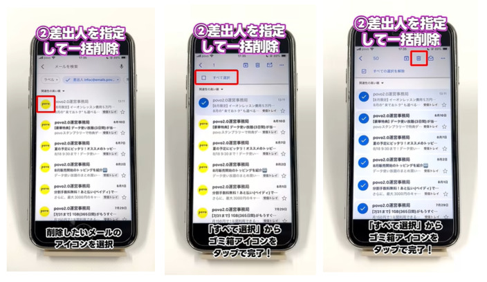 5. 「すべて選択」をタップし、ゴミ箱アイコンを選択すると特定の相手からのメールを一気に削除可能