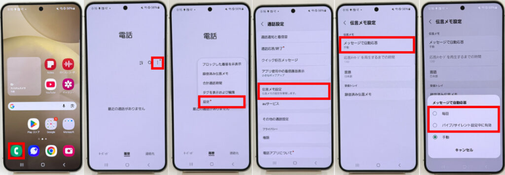 Galaxyシリーズにも「伝言メモ(簡易留守録)」として留守番電話のような機能が実装されています。