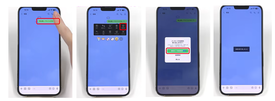 それでは、具体的に「通知なしで送信取消」を行う方法を解説します。操作自体は非常にシンプルで、数タップで完了します。